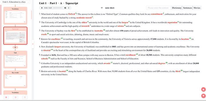 大学英语听力智慧教学系统:旨在帮助学习者循序渐进地提高英语听力水平,其特色亮点在于广泛收录多样听力素材,融合多种英语口音,营造全面锻炼的语言氛围。