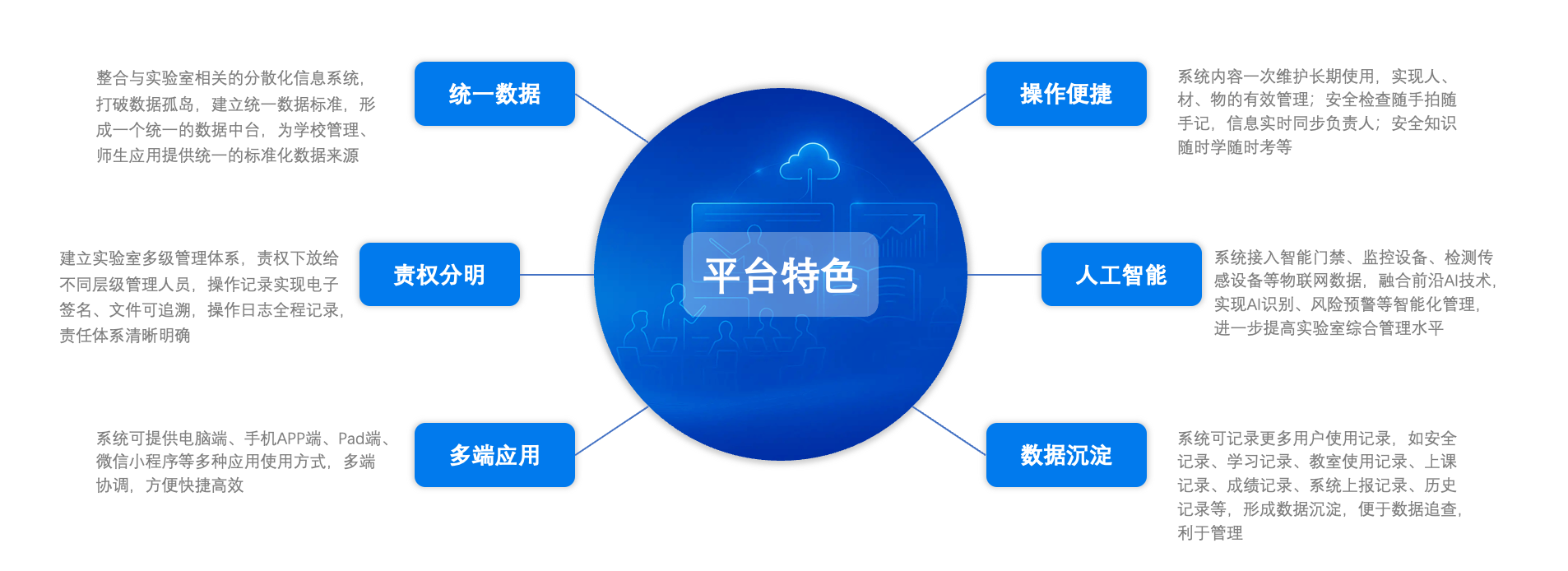 高校实验室综合管理解决方案:遵循相关安全管理规范标准,融合前沿AI技术,配备多元化业务功能模块,形成一套集成化管理体系。