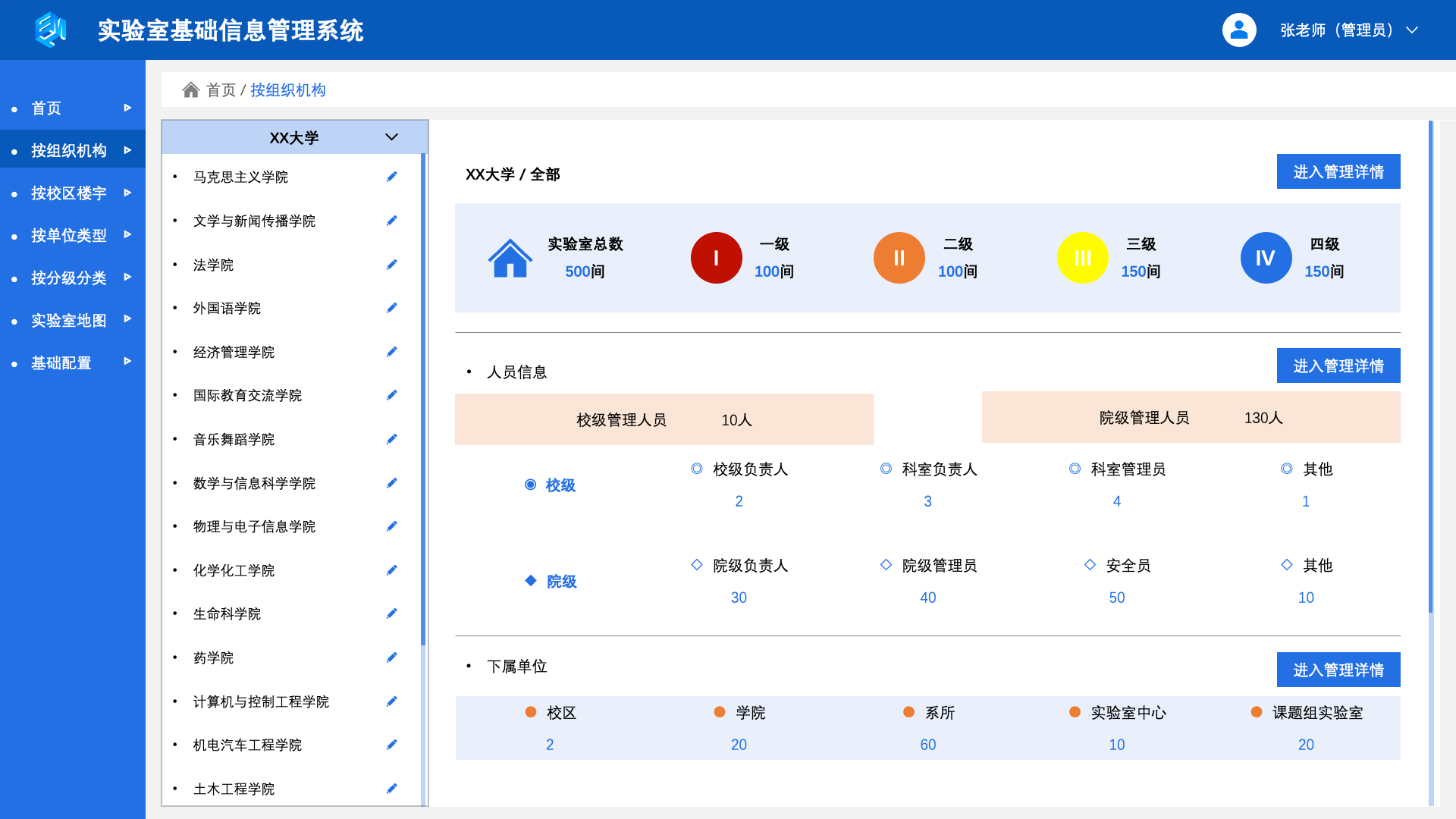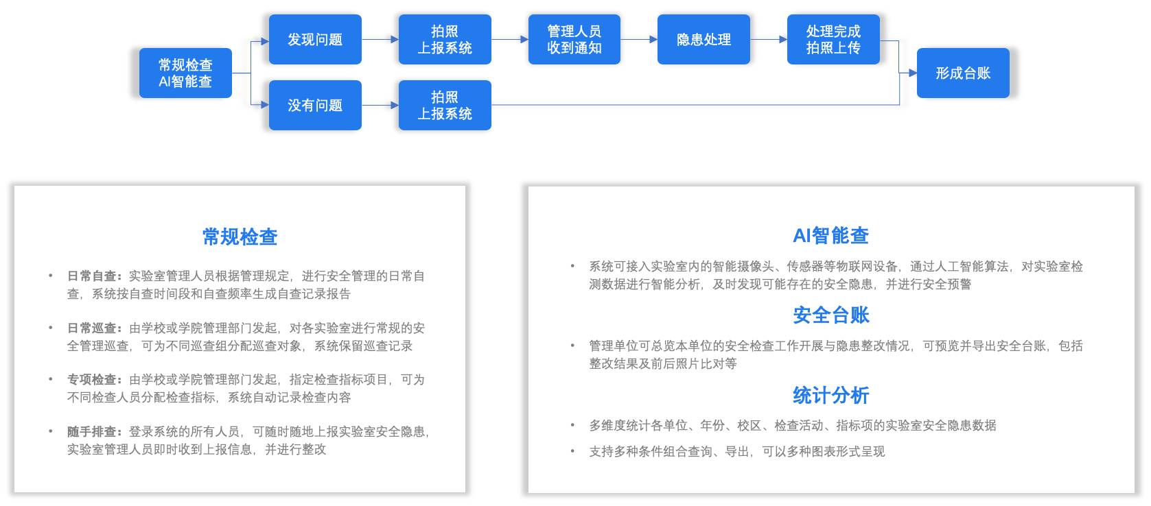 针对高校实验室特点,围绕实验教学和科研活动中涉及到安全问题的各要素,构建实验室安全管理系统,通过多种检查形式,实现校、院、实验室全方位督查、巡查、自查工作的开展,落实隐患整改闭环的精细化管理。