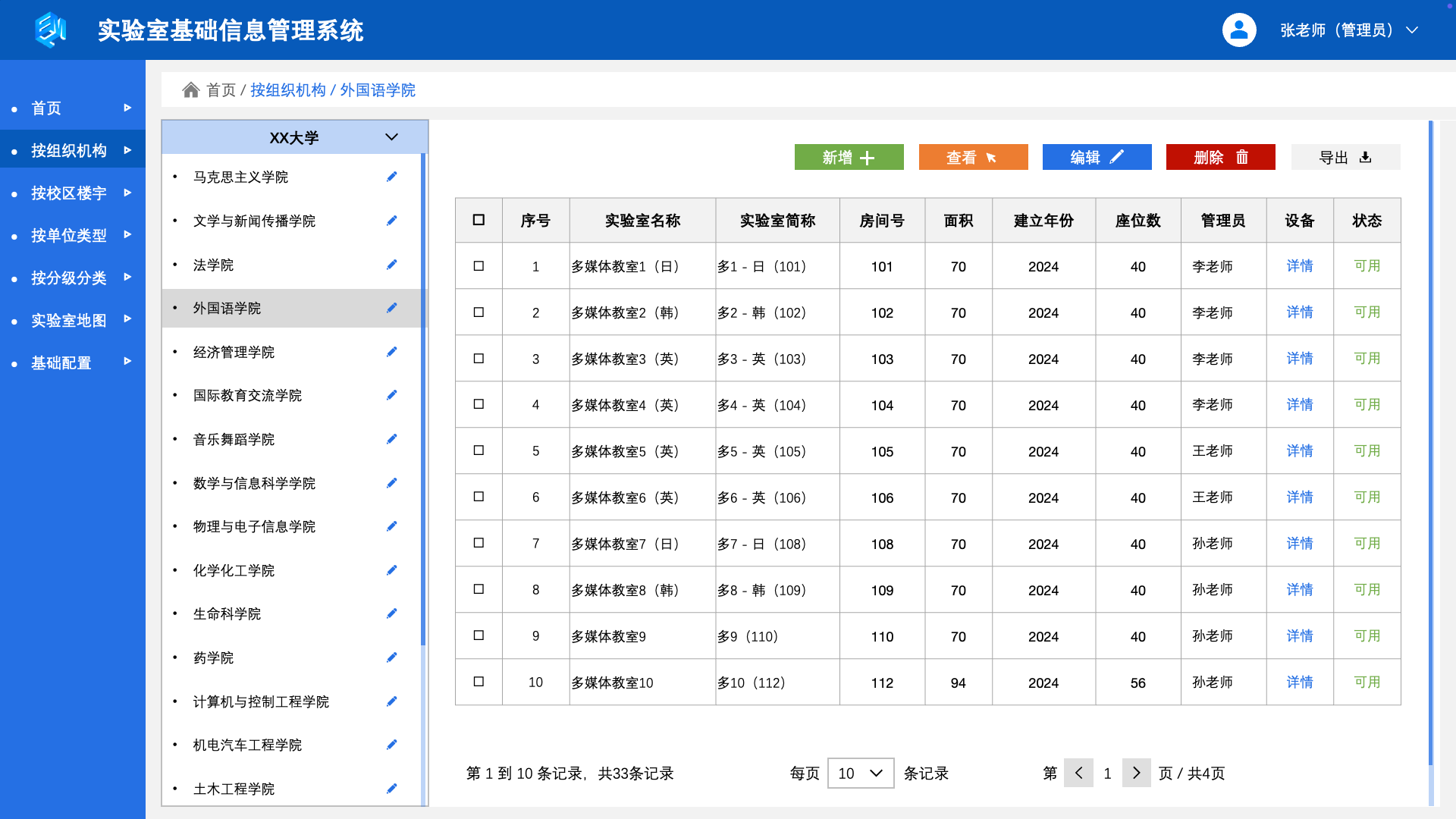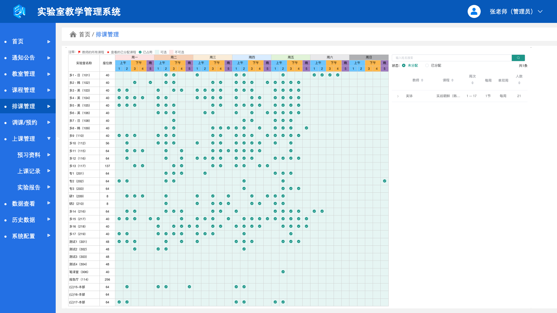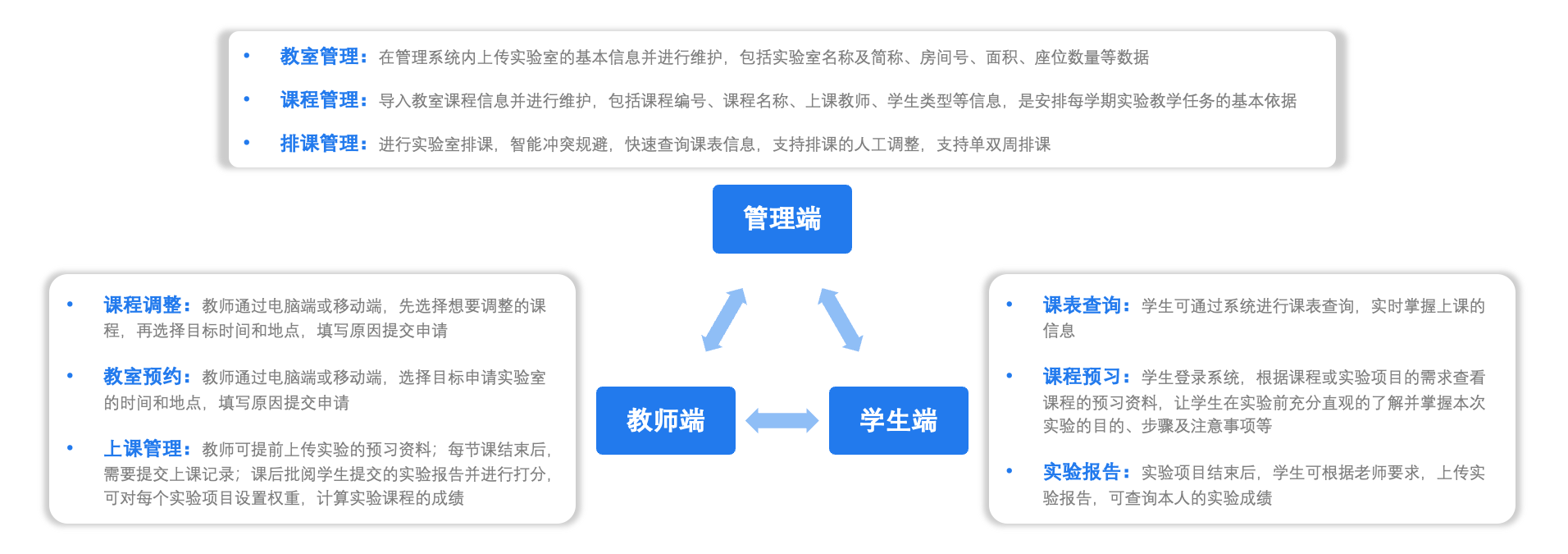 能够实现实验教室(以及其他如多媒体教室等公共空间)和实验教学的全过程管理,主要包括管理端的教室、课程、排课等管理,教室端的调课、预约、上课等使用,学生端的查询、预习、报告等内容,减轻实验人员等工作负担,实现实验教学管理的规范化和信息化,提高实验室管理及实验教学的质量。