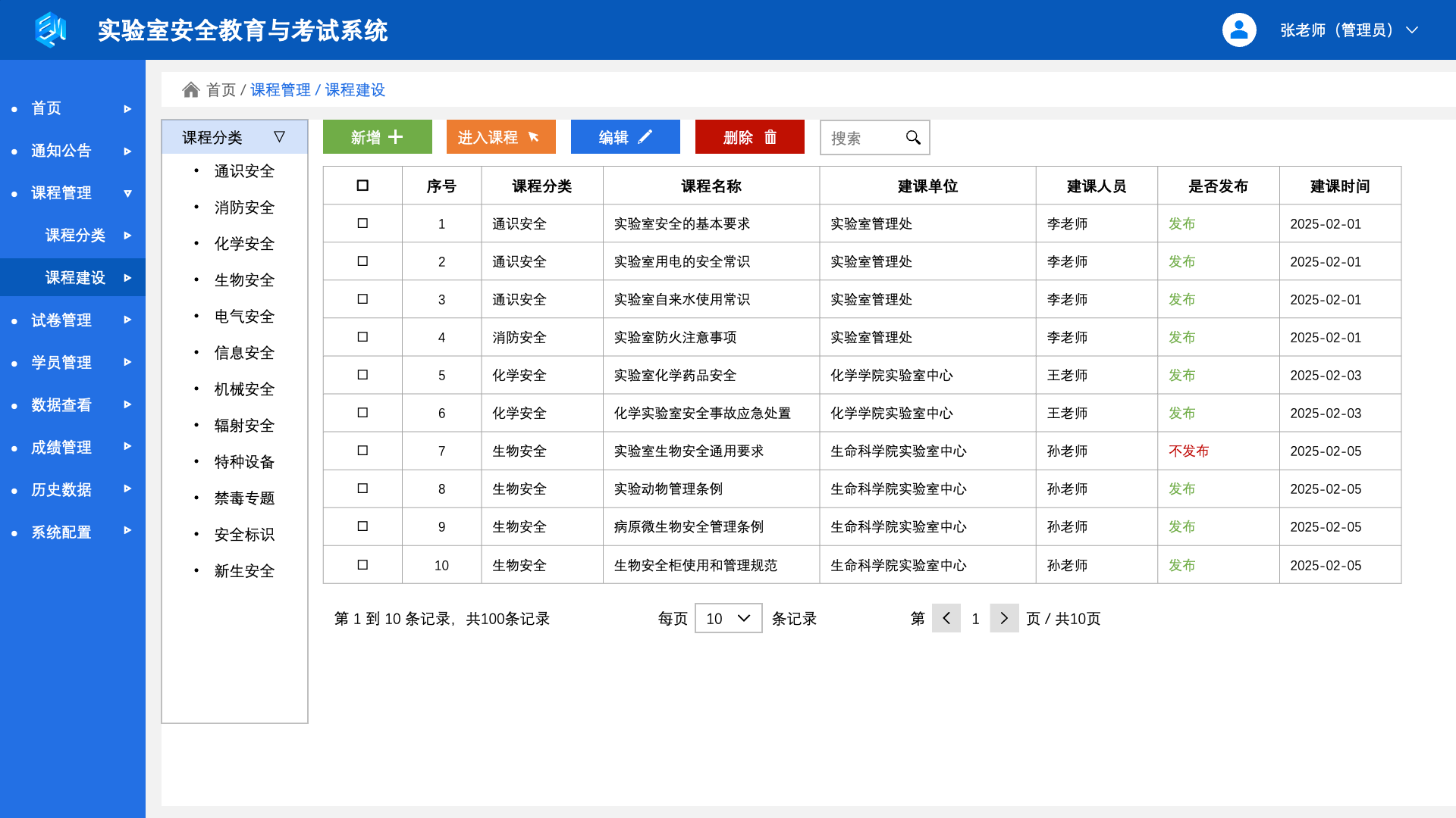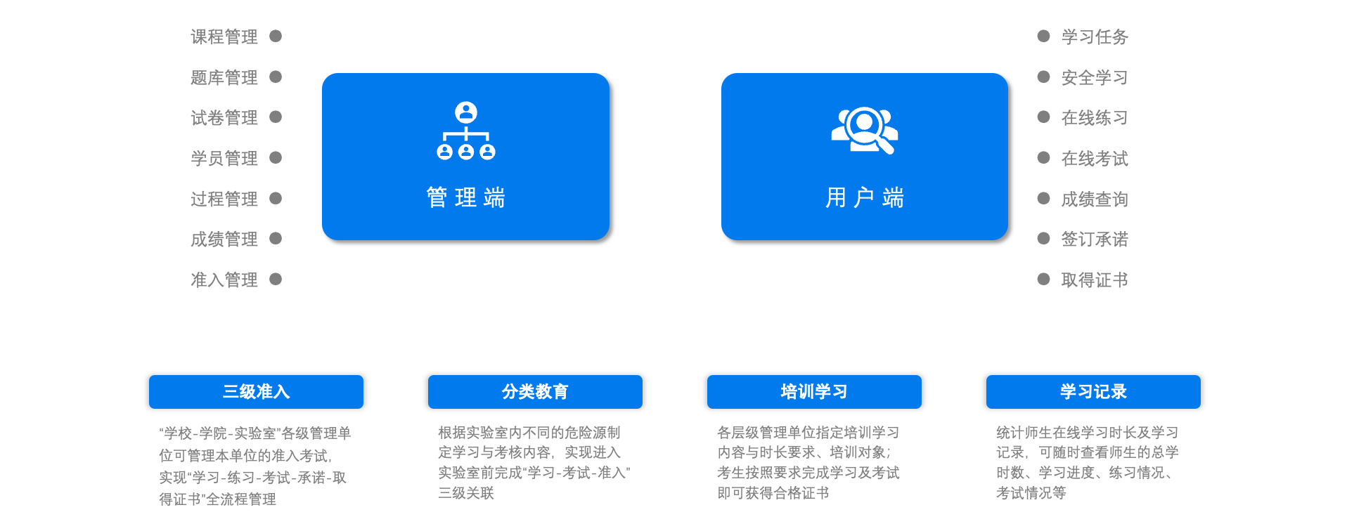主要包括课程建设、题库建设、试卷建设、在线学习、在线练习、在线考试等功能模块,帮助高校便捷化进行实验室安全教育,实现对人员安全准入的高效管理,全面提升实验室的安全运行与防护水平。