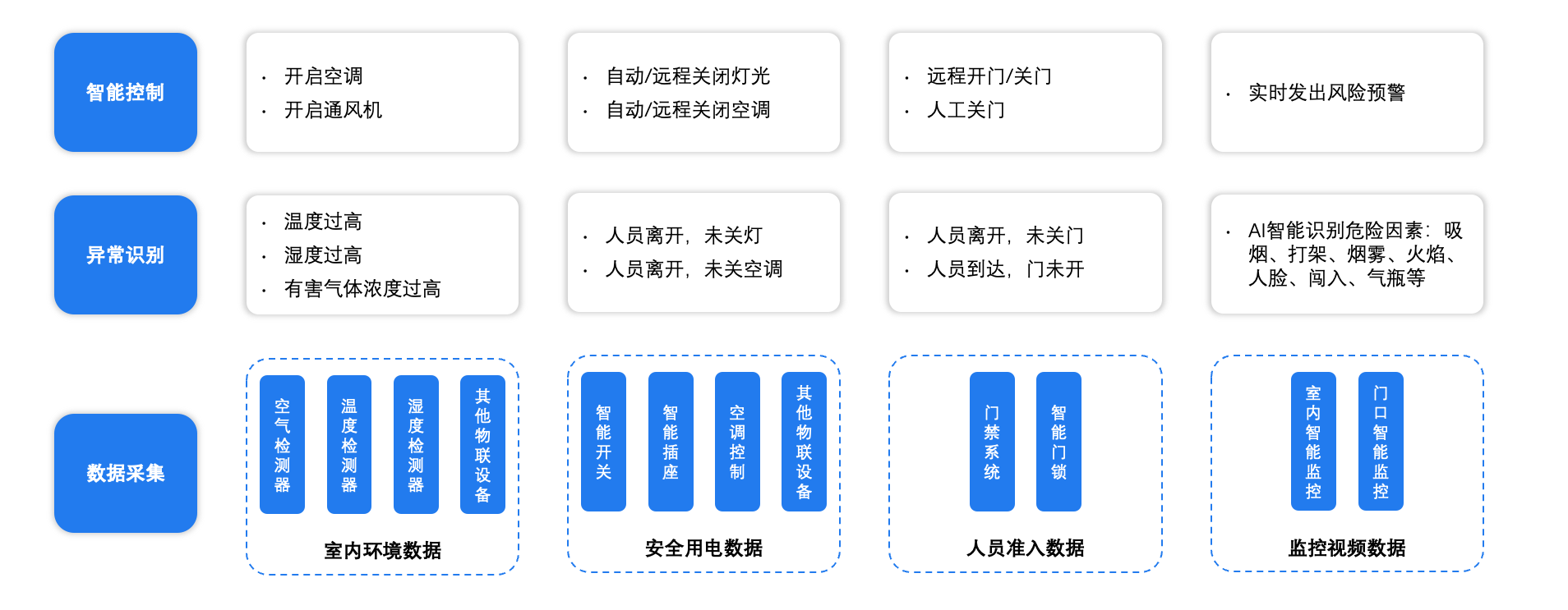 利用物联网+ AI 技术,将实验室内的智能设备进行整合,对空气质量、温湿度、用电、门禁准入等进行智能监控、自动联动,对监控视频进行实时分析,检测危险因素进行预警,打造安全、无忧的实验室环境。