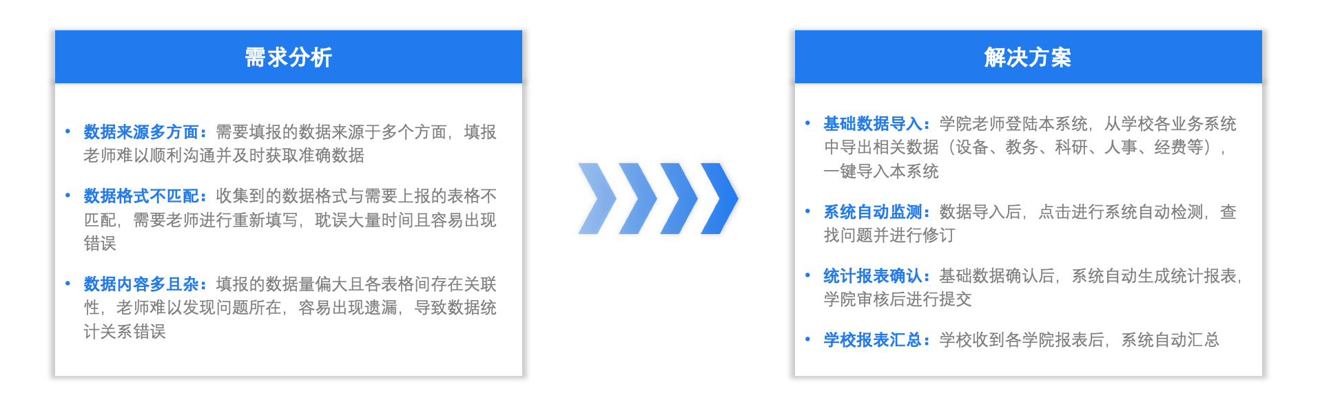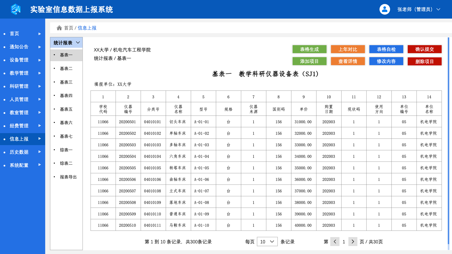 以教育部《高等学校实验室信息统计系统》要求为标准,结合实验室基础数据及学校各业务系统数据(设备、教务、科研、人事、经费等),以实验室为单位分别进行数据运算调整,以学院为单位进行数据审核并上报学校,系统自动合并形成教育部要求的七张基表及两张综表,审核后最终实现报表的一键上报功能。